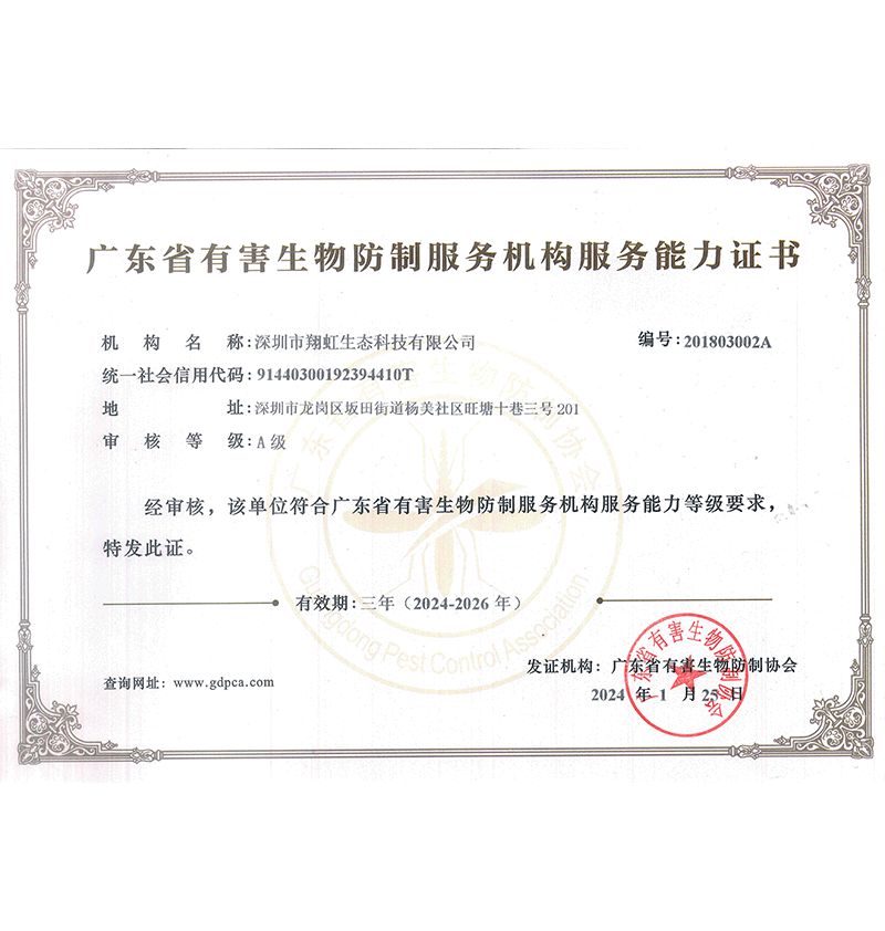 深圳市翔虹生態(tài)科技有限公司成立于1995年,是深圳最早成立的專業(yè)蟲害防治公司之一。公司發(fā)展至今獲得全國有害生物防制服務(wù)A級資質(zhì)、廣東省有害生物防制服務(wù)A級資質(zhì)、深圳市有害生物防制服務(wù)A級資質(zhì)、廣東省有害生物防制服務(wù)A級資質(zhì)、深圳市有害生物防制服務(wù)甲級資質(zhì)的單位,是中國有害生物防治協(xié)會(huì)會(huì)員、廣東省有害生物防治協(xié)會(huì)會(huì)員、深圳市有害生物防治協(xié)會(huì)理事單位,多次獲得“深圳市十佳消殺單位”榮譽(yù)。